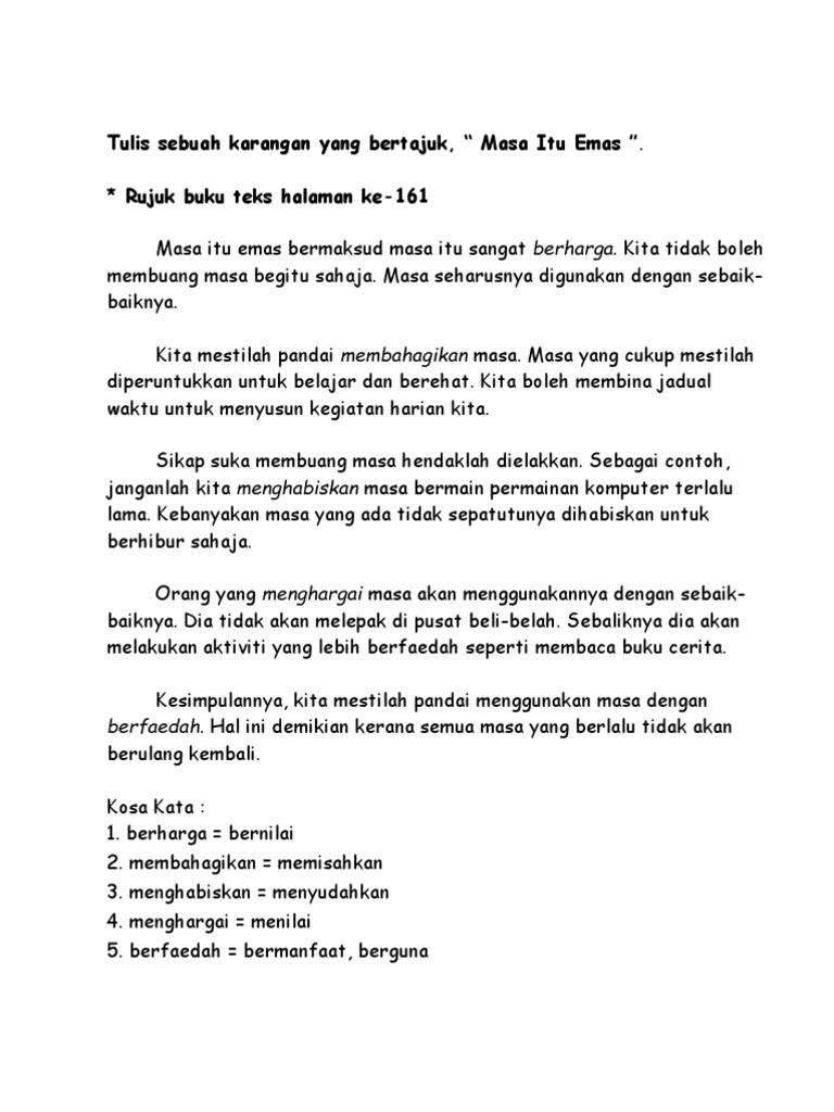 Sections of this page. SHAH ALAM - Peribahasa Melayu pernah menyebut masa itu emas yang membawa maksud masa itu sangat berharga dan janganlah dipersia-siakan. Maksud perkataan ini.
